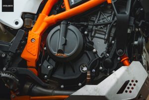 כמו ה-SMC-R והאנדורו R, גם האדוונצ'ר R מתבסס על הפלטפורמה של ה-390 דיוק עם אותו מנוע סינגל בנפח 399 סמ"ק המספק 44 כ"ס ו-4 קג"מ ומותאם לתקינת יורו 5 פלוס המחמירה. חלקה המרכזי של שלדת הצינורות משותף אף הוא יחד עם יתר בני המשפחה, אך מעבר לכך נעשו שינויים מקיפים בהתאם לייעוד של כל אופנוע. במקרה של האדוונצ'ר R מדובר בגאומטריה שונה לזווית ההיגוי וכידון מוגבה, שלדת זנב אחורית חדשה מאלומיניום וזרוע אחורית חדשה עם נקודות עיגון שונות לבולם החצי אופקי.