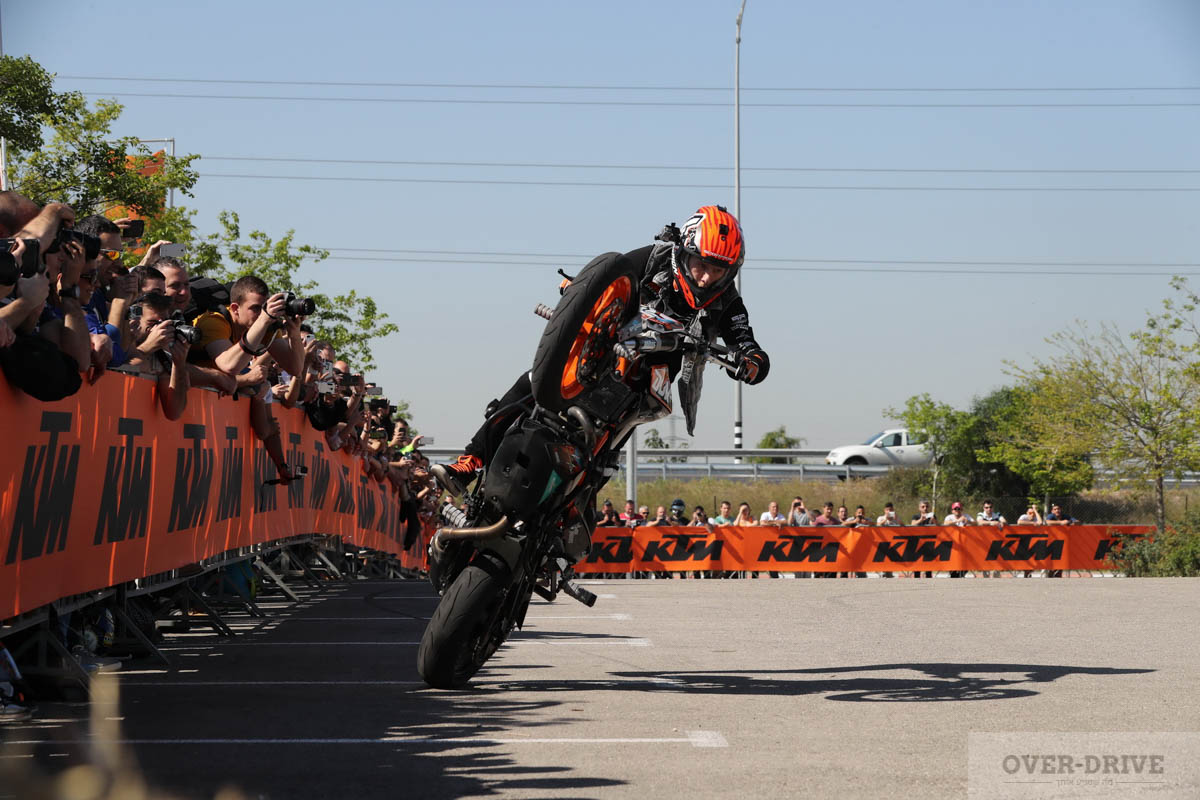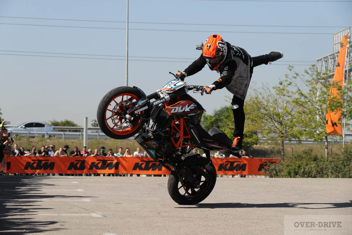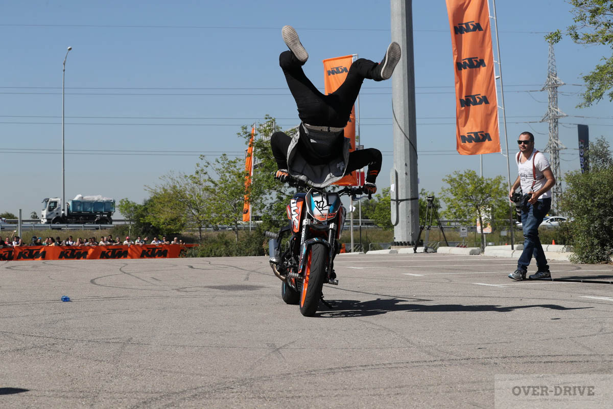 וזה היה מוזר מאוד, אופנוע סטאנטס שבנוי לאתלט זעיר מימדים לא ממש הרגיש לי נוח. ההילוכים סופר קצרים. אני שם אותו בשני ונותן דאבל בשביל להרים אותו – אבל אני כבר במנתק. צריך לכוון את המוח. רוק מרים את האופנוע מהמקום, בראשון, ומשם ממשיך מעביר הילוכים אם צריך. זו רכיבה שונה מאוד מזו המוכרת לי ולך. הווילי מתרחש במהירויות אחרות בקצב אחר, ראש אחר. להטוטנות. הבלמים אדירים – ובאמת שכחתי לספר על הדיסק הענק מלפנים. אין בעיה לשתול את האופנוע הזה על האף כמו שאין שום בעיה להחליק בשליטה מלאה את האחורי.