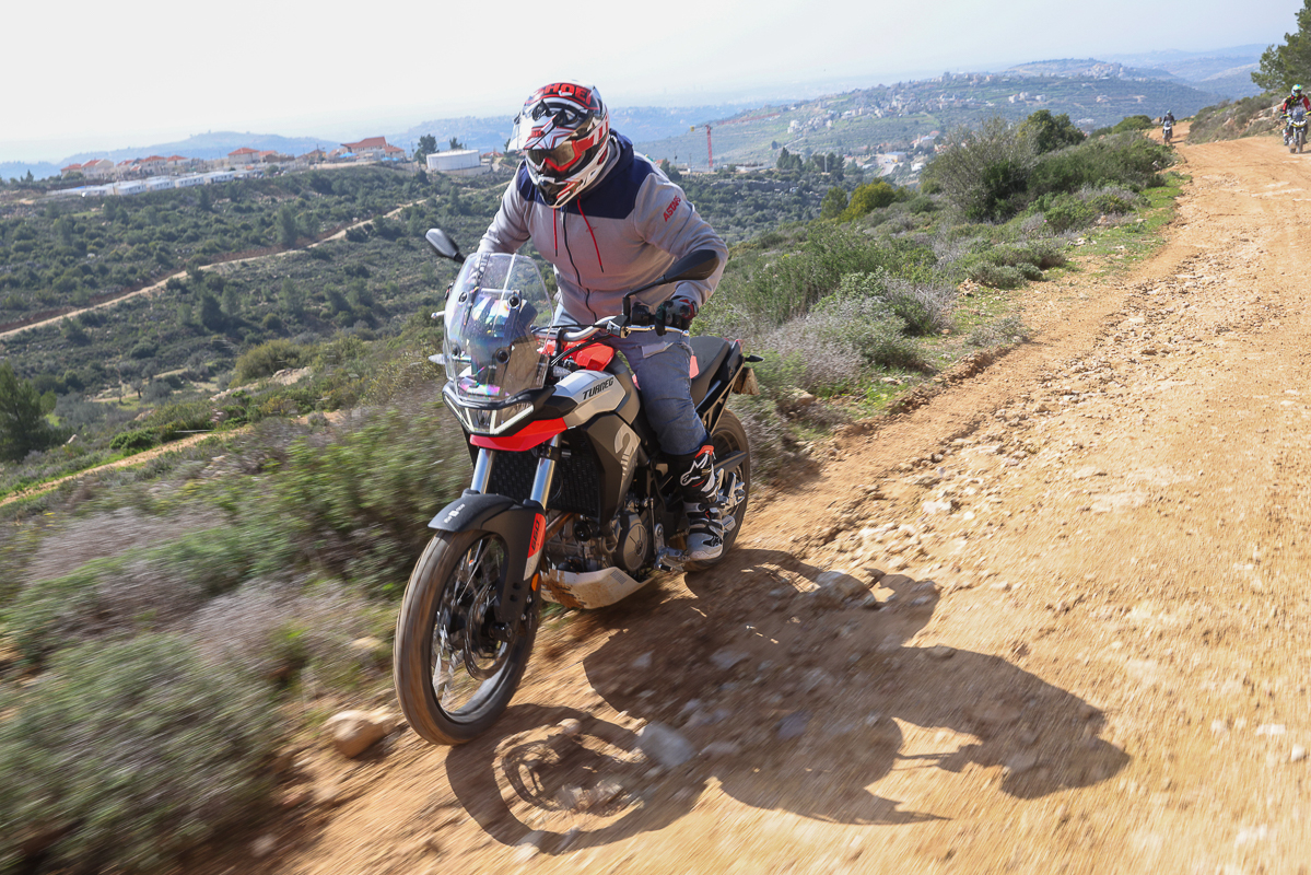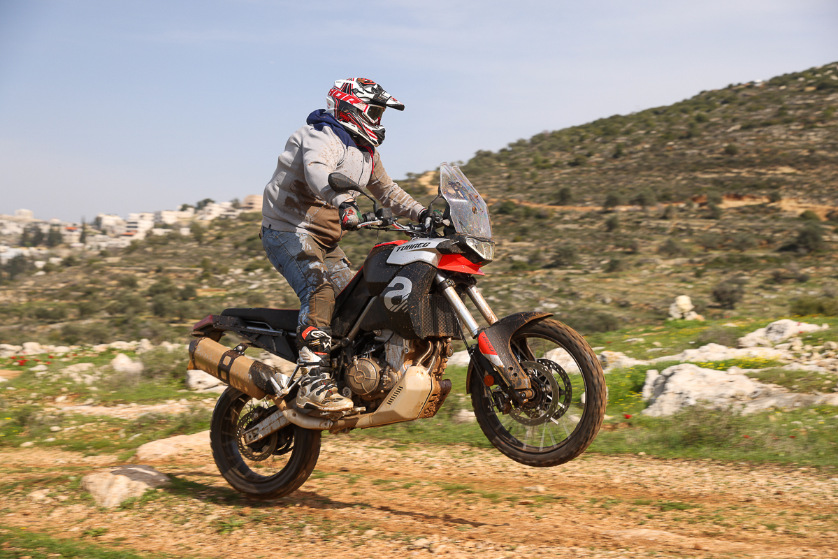 ההשקה המקומית, הציעה תוואי מעורב של כ-120 ק"מ, חלק גדול ממנה נערך בשטחי חבל בנימין הנפלא. בין זית למעין, אפשר היה להתרשם מאופיו של הטוארג, גם על הקרקע הקשוחה של האזור. יחידת ההנעה התגלתה כשותפה יעילה מאוד בתנאים ירודי אחיזה. יש מספיק כוח למטה בכדי לייצר תנועה ואופי הכוח הנשלח לגלגל האחורי מייצר אחיזה מרשימה גם כשבקרות מנותקות. מי שנהנה דווקא מאיבודי אחיזה של האחורי יקבל את אלו במעלה הסל"ד אם ייבחר לעשות זאת. תנוחת הישיבה בעמידה נוחה מאוד, קל לנוע לפנים ולאחור גם בעמידה ולהתאים את התנוחה למצב. המנוע כאן מוצב בזווית שונה בתוך השלדה, זקוף יותר, לפי אפריליה זה אמור לשפר את היכולת בשטח. מה שבטוח, שכל החשיבה כאן, מיקום המנוע, השלדה, המכלולים, הורדת מרכז הכובד, כל אלו משחקים כאלו לטובתו ולטובת הרוכב.