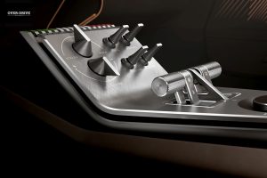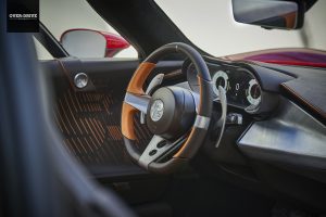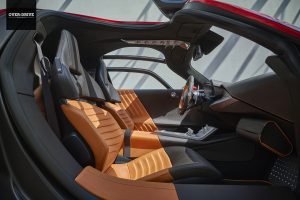 תא הנוסעים מינימליסטי ומשלב גם הוא בין טכנולוגיה עדכנית למראה קלאסי. לוח המחוונים דיגיטלי בעל תצוגה משתנה, פתחי המיזוג מוסווים בין משטחי לוח המכשירים והמתגים הבודדים לתפעול המערכות פזורים בין הקונסולה המרכזית לתקרת המכונית, כאשר הכל עשוי אלומיניום מלוטש, וכך כם שני המנופים המשמשים כבורר הילוכים. המינימליזם הולך צעד רימה כאשר אין תא כפפות, ומקום זאת מותקן נרתיק עור מול ברכי הנוסע שמלפנים.