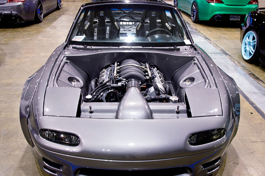 הביצוע פשוט מדויק ועושה רושם מקצועי מאוד. אז הנה קצת פרטים. ה-V8 שנכנס לתוך המיאטה הזו הוא LS3 בנוי מאפס, המוציא 525 כ"ס סוס ומעביר את הכוח לגלגלים דרך תיבה עם שישה הילוכים ומצמד של קורבט ZR1.