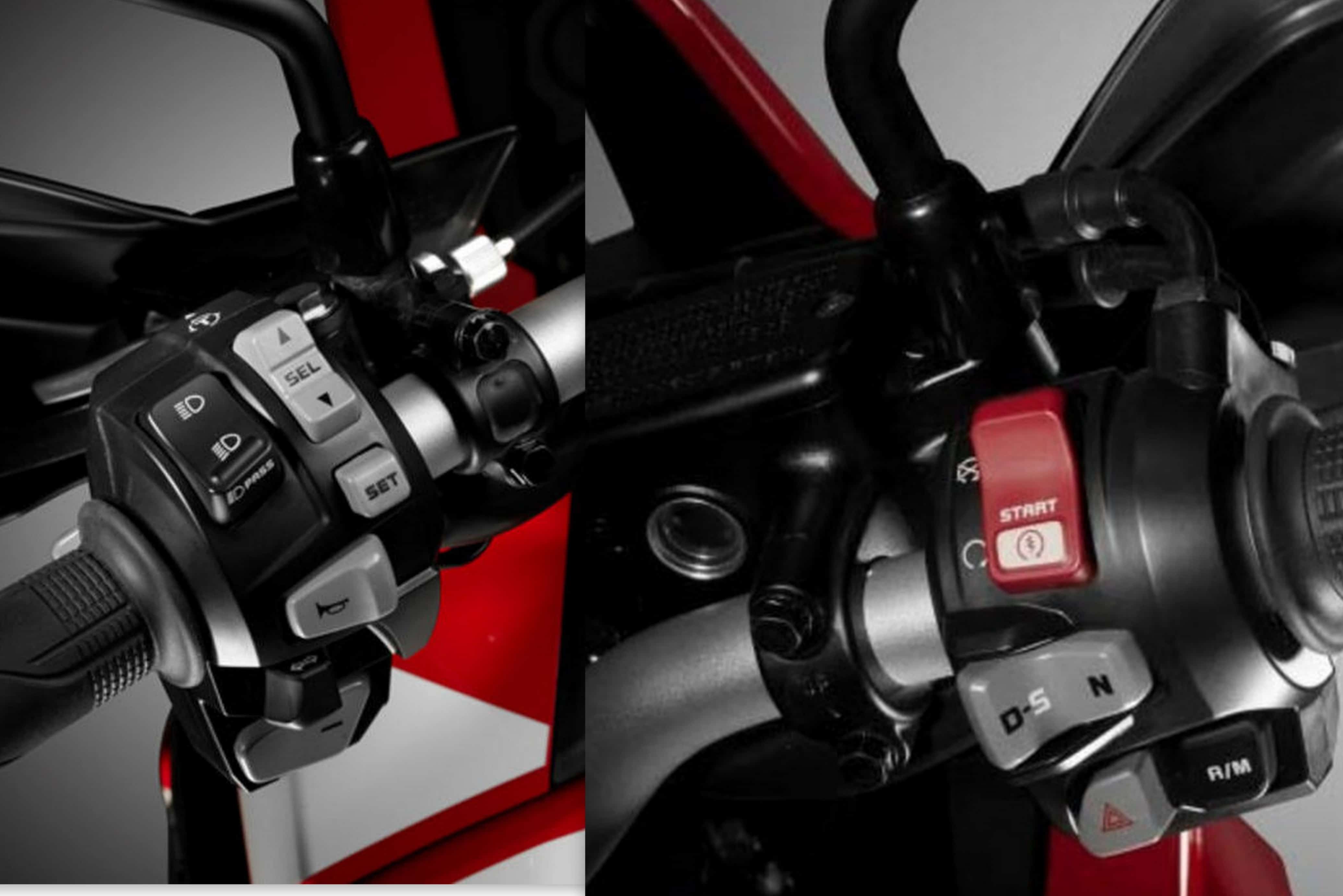 עוד משהו שבולט ביד שמאל – היא ידית שעשויה להיראות כמו ידית קלאץ' אבל ממוקמת רחוק מאוד מהכידון – זו ידית בלם היד. מבט אל הרגליות מגלה שאין רגלית הילוכים מצד אחד ובליטה גדולה מצד שני, שם מצויה תיבת ה-DCT. יש גם כפתור G שמכניס לתוך התובנות של התיבה הזו, גם את הזווית בה נוסע האופנוע ומשפר עוד יותר את התאמת תגובתה לדרך.