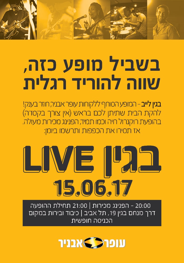 ​היום (חמישי) בשעה 20:00, ייערך הפנינג בגין לייב בסניף עופר אבניר ברחוב מנחם בגין 19, תל-אביב. הכניסה חופשית לקהל הרחב.