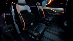 הפלטפורמה החשמלית אפשר להסיט את לוח המכשירים לפנים ולהאריך את חלל תא הנוסעים ב-10 ס"מ. סידור המושבים הלא אופייני לטנדרים כולל שני מושבי קפטן נעים על מסילה בשורת המושבים השניה, עם חידוש בדמות שורת מושבים שלישית הכוללת שני מושבים נשלפים מדופן הקיר האחורי, בדומה למקובל בטנדרים בעלי תא נהג מוארך. מעבר לכך תא הנוסעים כולל מסך מרכזי בגודל מרשים של 28 אינטש, תצוגה עילית עשירה ותאורת אווירה היקפית המשלימה תחושה של הייטק ופחות רכב עבודה.