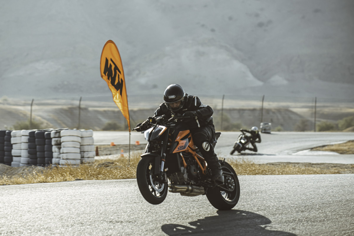 ק.ט.מ הביאו שני 890 בתוליים ו-1290 דנדש לכבוד האירוע. ולידם בפיטס כל אופנוע הדגמה אחר שנח באולם היבואן. חבר את זה לחום האדיר בבקעה, לקולגות שלא תמיד יודעים איפה עובר הגבול ולעובדה שמדובר בכלים כוחניים למדי, ותסכים איתי – ביצים גדולות.