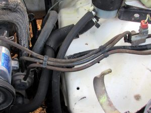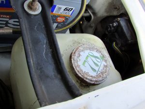 תחת מכסה המנוע המצב טוב יותר, ואני מופתע בכל פעם מחדש כשאני רואה את כל המחברים ומחזיקי הצינורות המקוריים נמצאים שם, מחזיקים מעמד. יש שני ריג'קטים משמעותיים מתחת למכסה המנוע. האחד הוא מיכל המים של המגבים, או יותר נכון המנוע החשמלי שבו. גם המכסה המקורי אבד והבעלים מצא פתרון… אהמ… מקורי. העניין השני שצריך לטפל בו – הקרבורטור שלא מתפקד יפה בסל"ד נמוך. הוא מקרטע ממש בסל"ד סרק ורק שנותנים גז הוא מתייצב ועובד עגול ויפה.