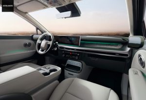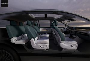 תא הנוסעים נאמן לקו העדכני של יונדאי עם צמד מסכים קעור הצמוד זה לזה בחלקו העליון של לוח המכשירים ופאנל פיקוד נפרד המשלב גם מתגים פיזיים לתפעול בקרת האקלים. הקונסולה בין המושבים הקדמיים נפרדת ומאפשרת לייצר רצפה שטוחה, כשהיא נעה גם לאחור שם ניתן לקבל סידור המושבים עם מושבי קפטן נפרדים מתכווננים חשמלית ומסתובבים עם הדום נשלף בשורת המושבים השניה. שלושת שורות המושבים מתקפלות כדי לייצר רצפה שטוחה, וגם כאשר שלושת השורות בשימוש ישנו נפח של 620 ליטר בתא המטען לא כולל 52 או 88 ליטרים נוספים בתא המטען הקדמי. תא הנוסעים כולל שפע תאי אכסון גלויים ונסתרים, שקעי טעינה, פתחי מיזוג לשלושת שורות המושבים, כאשר גם כאן ניתן למצוא שימשו נרחב בחומרים ממוחזרים בחומרי הדיפון.
