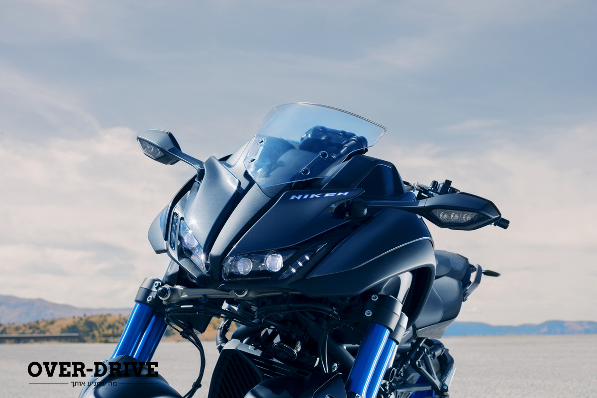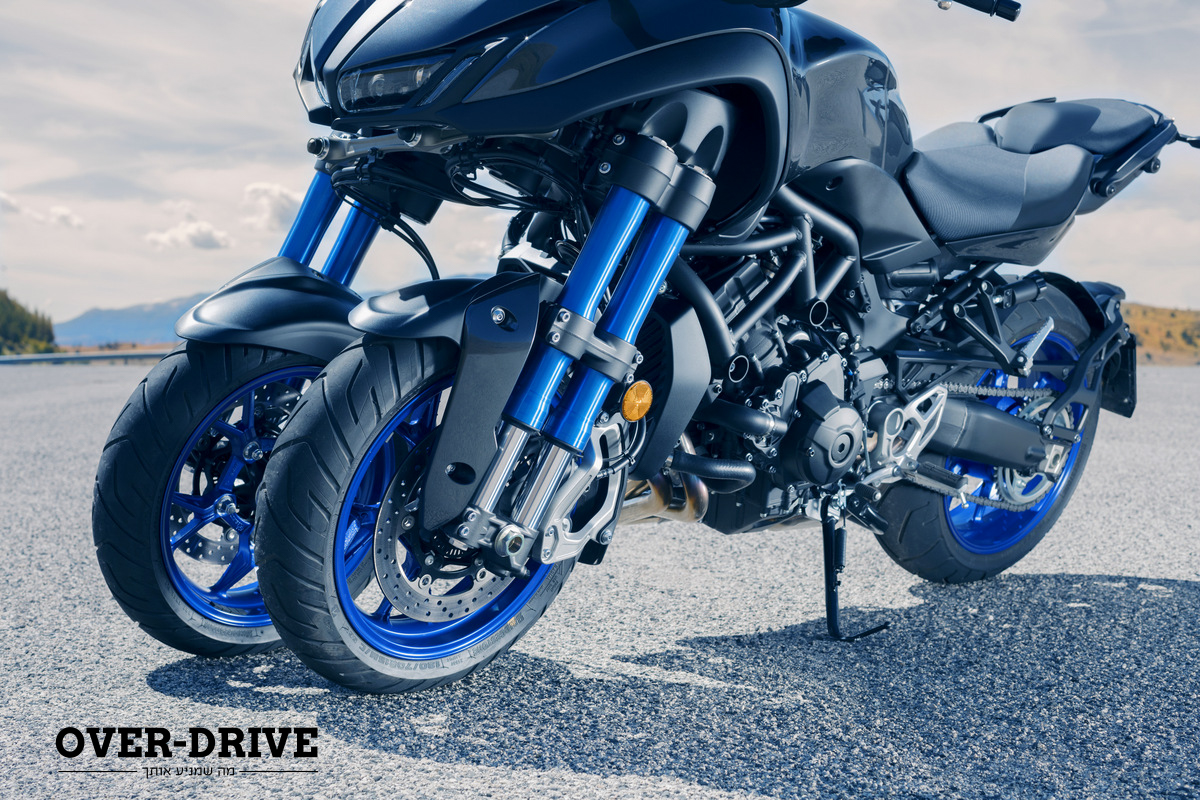 אבל הסיפור של האופנוע הזה נמצא מלפנים, במתלה הקדמי המתוחכם. שוב, בימאהה מבטיחים לחשוף הרבה יותר בהמשך אבל כבר עכשיו ניתן לראות בבירור יישום ייחודי של רעיון מנגנון ההטיה המוכר מקטנועים תלת-גלגליים. כאן ימאהה התאימה לו צמד מזלגים הפוכים, אחד בכל צד, כאשר בקצה נמצאים צמד גלגלים בקוטר 15 אינץ'.