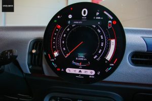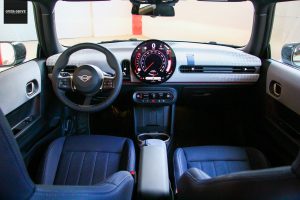 הדיסוננס ממשיך כשנכנסים לתא הנוסעים שהוא זהה לזה של המיני החשמלית. שיקולי עלויות אתם יודעים. זה טוב כי הקווי העיצוב הקלאסיים והנקיים נשמרו כאשר העיגול הגדול במרכז לוח המכשירים הוא כעת מסך פונקציונלי המשמש כלוח מחוונים ומערכות המולטימדיה, הניווט ובקרת האקלים יחד. רעיון נחמד, אבל הביצוע פחות מוצלח בגלל העומס על מסך קטן יחסית לריבוי המשימות וגרפיקה מתחכמת ומצועצעת, למרות שיתן לקבל גם מתצוגת מחוונים בסגנון רטרו, אבל רק כחלק ממצב נהיגה מסויים.
