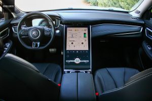 עיצובו החיצוני של MG מארבל R ממחיש זאת. הוא קרוסאובר נאה, מרשים למראה ולא צעקני. לפני שנתיים היה ניתן להגדיר אותו אפילו כמיוחד במידת מה. אבל כיום הוא פשוט נראה כמו עוד קרוסאובר חשמלי שמגיע מסין, ויש הרבה כאלו, עם צלילית סטנדרטית ומאפיינים מוכרים כמו שבכה אטומה, פס לד לרוחב החרטום וידיות דלתות נשפלות. תא הנוסעים לעומת זאת מרשים יותר, בעיקר בזכות המסך אנכי הענקי המשולב במרכז הקונסולה המרכזית הצפה. מינימום מתגים, מושבים ספורטיביים למראה ושימוש בעור מלאכותי וחומרים רכים משלימים תחושה נעימה.