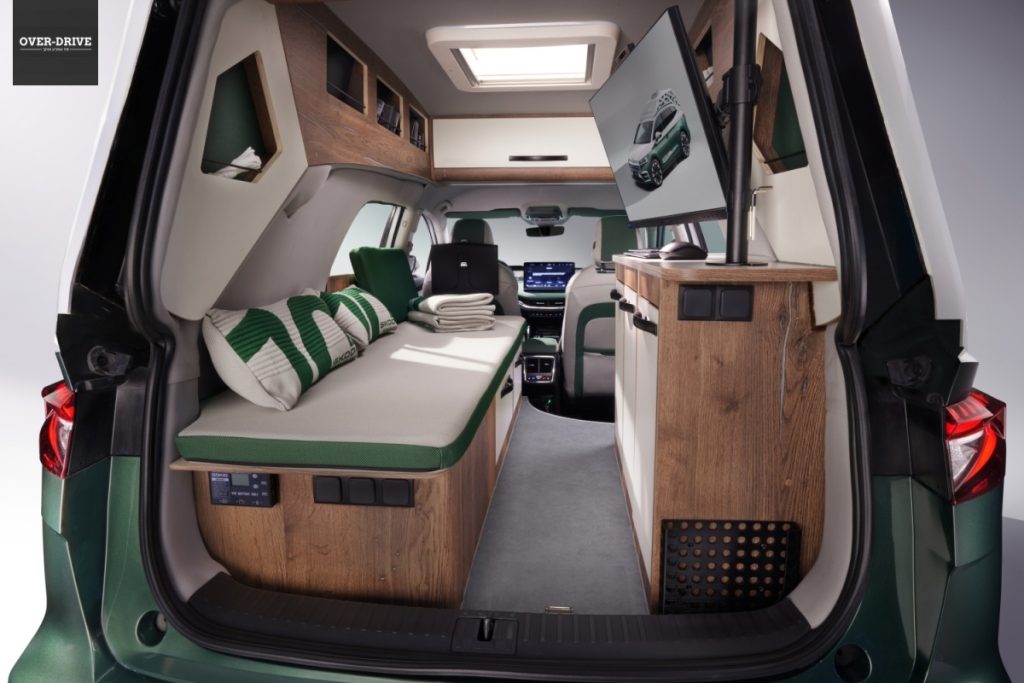 בנוסף לציוד הקמפינג והמשרדי בחלקו האחורי של הרכב, גם הנוסע שליד הנהג לא נשאר מקופח: זרוע מיוחדת מאפשרת לנוסע לחבר את הטאבלט שלו. עוד באבזור הפנים תוכלו למצוא רמקול אלחוטי, מקלחת סולארית, מכשירי חשמל למטבחון, כסאות, שולחנות, צלחות, סירים ומחבתות, כוסות, כבלי טעינה, שטיחים ודיפונים וכן לפידים וערכת הישרדות למטיילים ההרפתקנים.