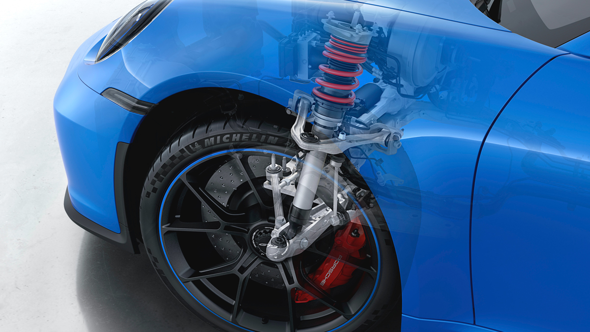 המפשקים כאן רחבים יותר ואפשר למצוא שימוש בעצמות עצה כפולות (לראשונה ב-911) מלפנים. מאחור יש עדיין מתלה רב-חיבור, כאשר פורשה מבצעת כאן גם שינויים והתאמות. זה אומר שלמכוניתה זו אין רכיבי מתלה זהים לאף 911 אחרת כרגע.