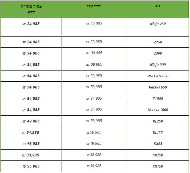 בהודעה שהוציאה קוואסאקי לשוק הישראלי, היא מבשרת על חיתוך מחירים משמעותי לדגמי האופנועים שלה. במסגרת הורדת המחיר קאוואסאקי נינג'ה 300 ו-Z300, יימכרו ב-34,985 שקלים במקום ב-39,985 שקלים, לדוגמה. רוצה עוד דוגמה? הוורסיס 1000 וה-Z1000 יימכרו ב-84,985 שקלים במקום 94,985 שקלים (טבלת המחירים המלאה שצורפה להודעת החברה מובאת מטה).