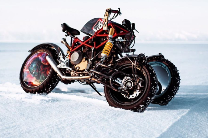 השינוי הברור ביותר הוא התאמת גלגל נוסף מלפנים. המתלה הקדמי לא נאה או אלגנטי אבל בהחלט מייצר חזות שונה על גבול המאיימת. הצמיגים ממוסמרים כמובן, רומזים על ייעוד של האופנוע – להתחרות על הקרח. בכדי שלא יחסר כוח הרוסים החביבים התקינו על הטווין הבולונזי מגדש GT35 של גארט. אין נתון הספק אבל בהתחשב במצע שעליו יתחרה האופנוע (שה עדיין אופנוע?) הזה כוח זה לא מה שהיה מטריד אותנו.