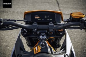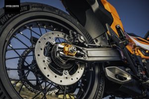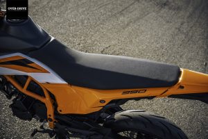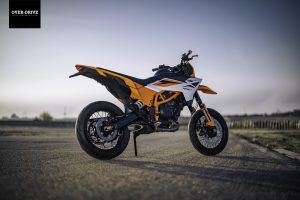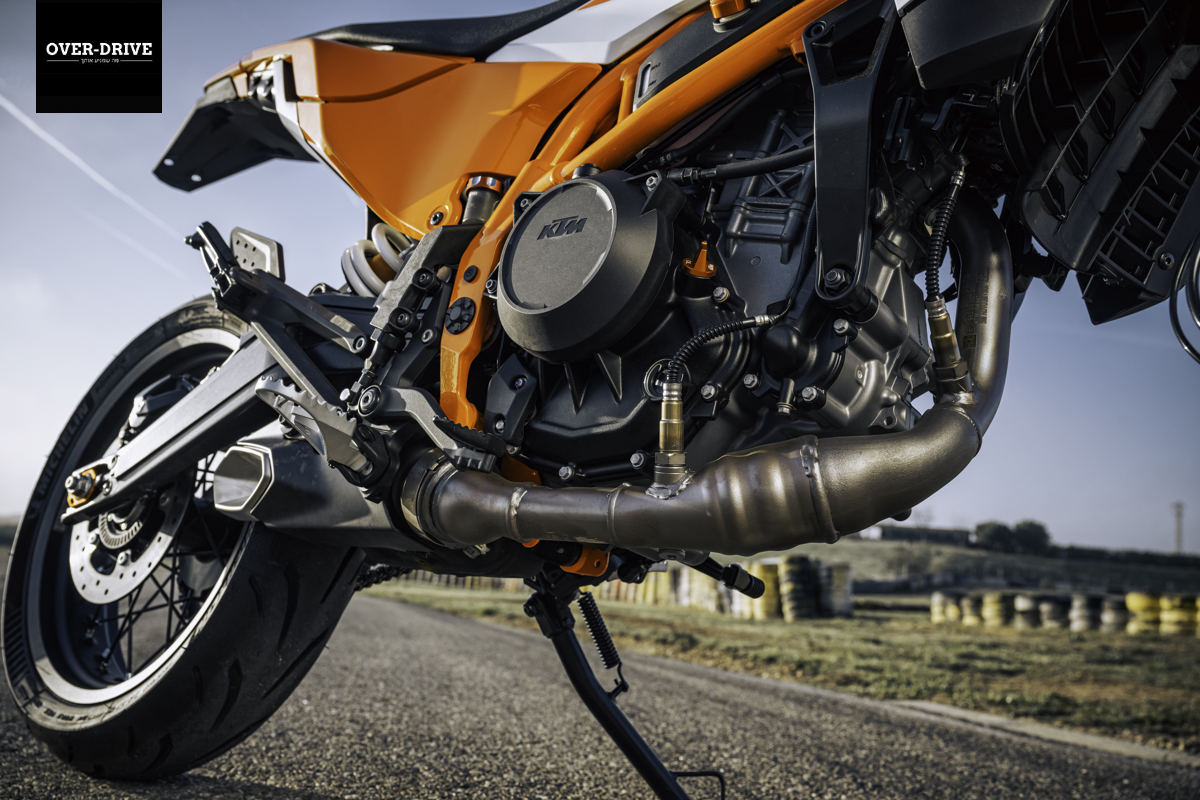 בשלושתן הוא יושב בתוך שלדת מסבך צינורות פלדה ומוציא 44 כ"ס, אבל מכאן הגרסאות מתפצלות. גרסת ה-SM שלשמה נתכנסנו יושבת על מתלי WP עם 220 מ"מ מהלך וכוונון מלא, דיסק קדמי מוגדל עם קאליפר רדיאלי, גלגלי 17 אינץ' "שפיצים", קלאץ' מחליק, ומשום מה גם יחס העברה ארוך יותר (שתי שיניים פחות בגלגל"ש האחורי). כל זה שוקל 150 ק"ג, לפני תדלוק של תשעה ליטרים במיכל.