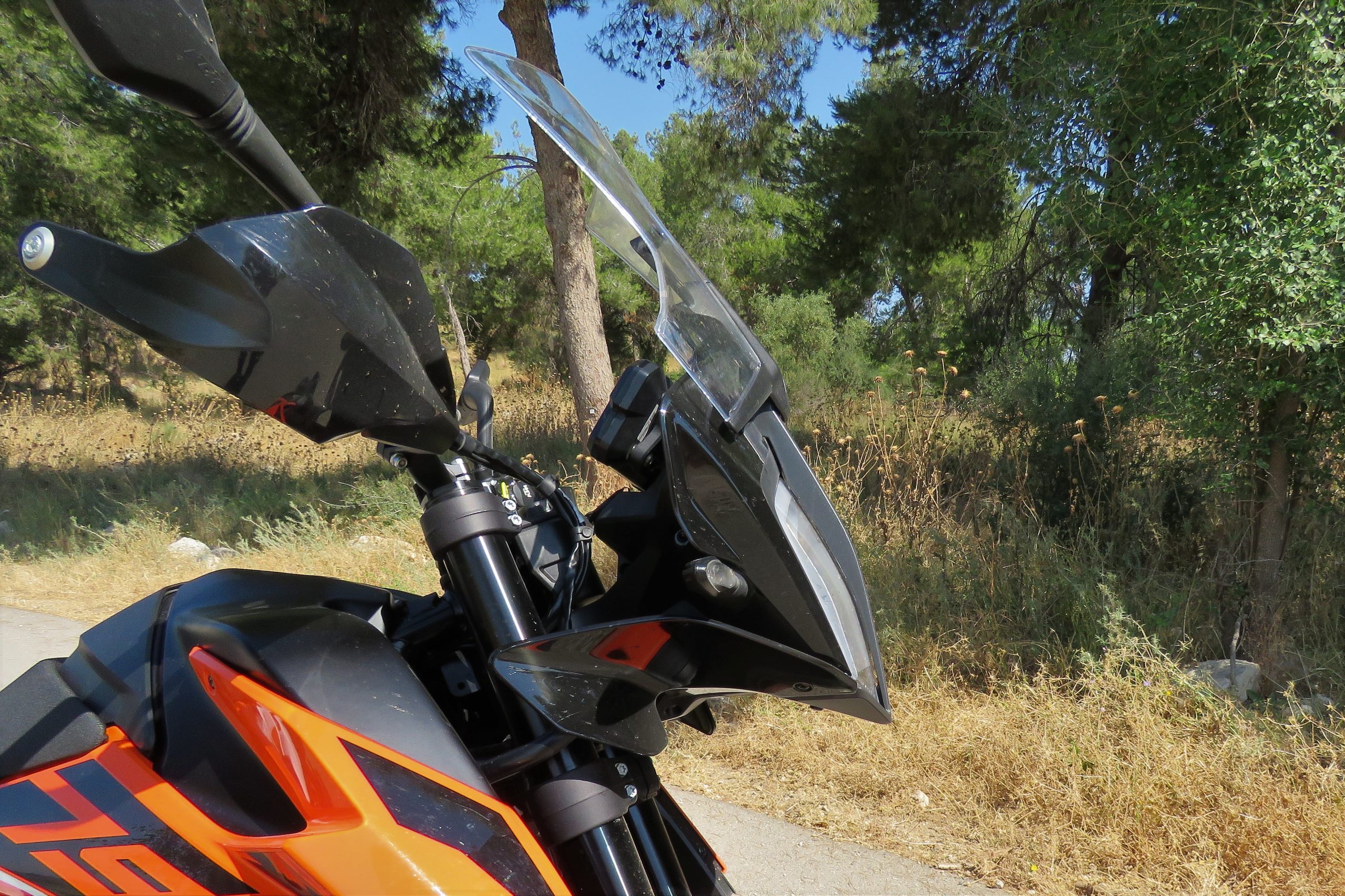 הק"מ עוברים וזה ממשיך להרגיש בנוח על הכביש. בכל הקשור להתנהגות, אין כאן יותר מדי זריזות. ההיגוי מרגיש כבד, האופנוע יציב ונטוע בהטיה, אם יש כאן מקורות שטח הם נמחקו היטב. מוטת הכידון הגדולה מסייעת בשינויי כיוון והתחושה טובה. אפשר ממש למהר עם הק.ט.מ הזה. כל עוד הכביש איכותי.