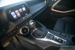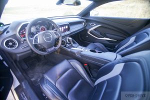 נכנסים לאוטו והתחושה המיוחדת נשמרת. ברור לגמרי שאתה נמצא במכונית עם מטרות ספורטיביות ולא בגרסה ספורטיבית למכונית רגילה. שלא תבין אותי לא נכון, הקמארו משתמשת בפלטפורמת הקאדילק ATS, אבל לפחות 70 אחוז מהרכיבים שונים וייחודיים לקמארו. לוח השעונים עמוס תפריטים ושעונים (כולל מד G, שעון עצר לבדיקת תאוצות ועוד), מושבי העור נראים טוב (אבל לא תומכים מספיק כמו שנגלה עוד מעט) וכשאתה מתיישב תנוחת הישיבה נמוכה, מייצבת אותך בין תעלת ההינע הגבוהה מימין למדרס המצוין לרגל שמאל. הגה קטום נמצא כמעט ניצב אל הנהג והנדסת האנוש טובה כשתלונה אחת נרשמה למתג ההנעה הנחבא מאחורי ההגה. העיצוב החיצוני בולט גם מבפנים – למרות שדה הראיה המצומצם. מכסה המנוע מקומר מול העיניים, תפיחות בתי הגלגלים האחוריים קופצות למראות. יש כאן הרבה עור בפינות אסטרטגיות ורק כשאתה מתחיל למשש אתה מרגיש פלסטיק פשוט למדי בעיקר בחלקו העליון של הדשבורד.