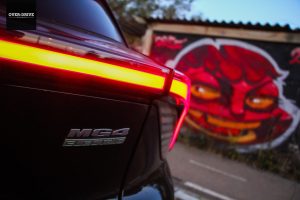 גובה של 150 ס"מ הוא קצת חריג עבור האצ'בק קומקפטית, כי אפשר להיות נמוך מידי היום בעידן הקרוסאובר, ואכן MG4 נמוכה רק ב-6 ס"מ מגי'לי גיאומטרי C, אבל היא נטולת סממני קרוסאובר מצועצעים בעיצובה. העיצוב עצמו מוצלח. לא משהו שלא פורץ דרך אבל החזית הקדמית המחודדת עם יחידות התאורה הצרות מקנה מראה ספורטיבי, והחלק האחורי שבו יחידת LED הממשיכה את קו המרכב והמתניים כמעין ספויילר מקנה נוכחות. דווקא במצב מהצד המראה מעט כבד מידי, תוצאה של שילוב בין קו חלונות גבוה לקורה C עבה.