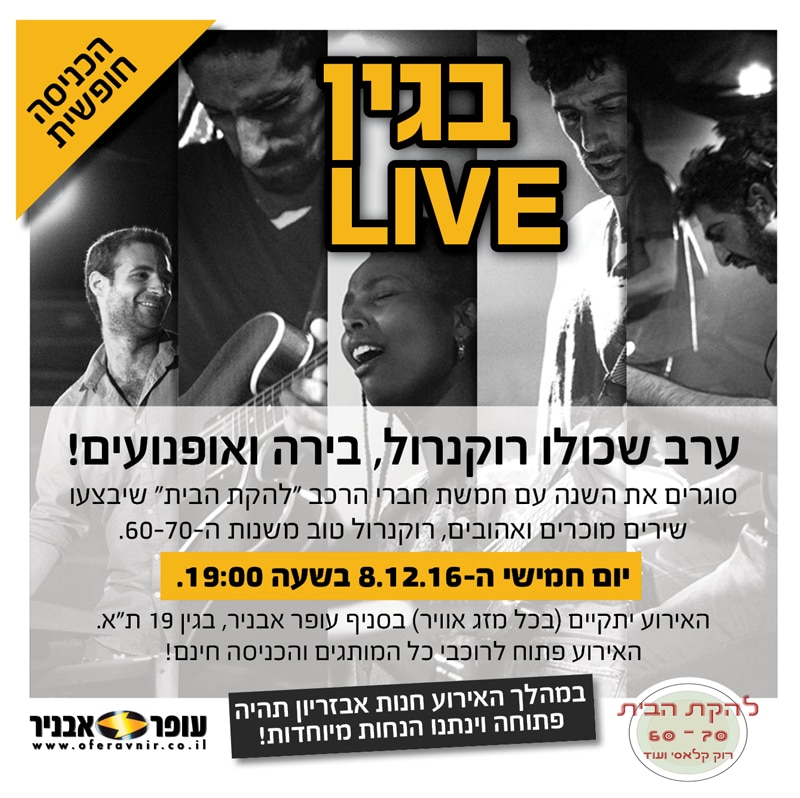 עופר-אבניר חוגגת את סוף השנה עם בגין LIVE – אירוע מוזיקלי עם חמשת חברי הרכב “להקת הבית” שיבצעו קאברים לשירים מוכרים ואהובים. במהלך האירוע חנות אביזריון בקומה השניה תהיה פתוחה ותציע מבצעים והנחות. האירוע יתקיים בסניף עופר-אבניר ברחוב בגין 19 בת”א, בתאריך 08.12.16 מהשעה 19:00 בערב.